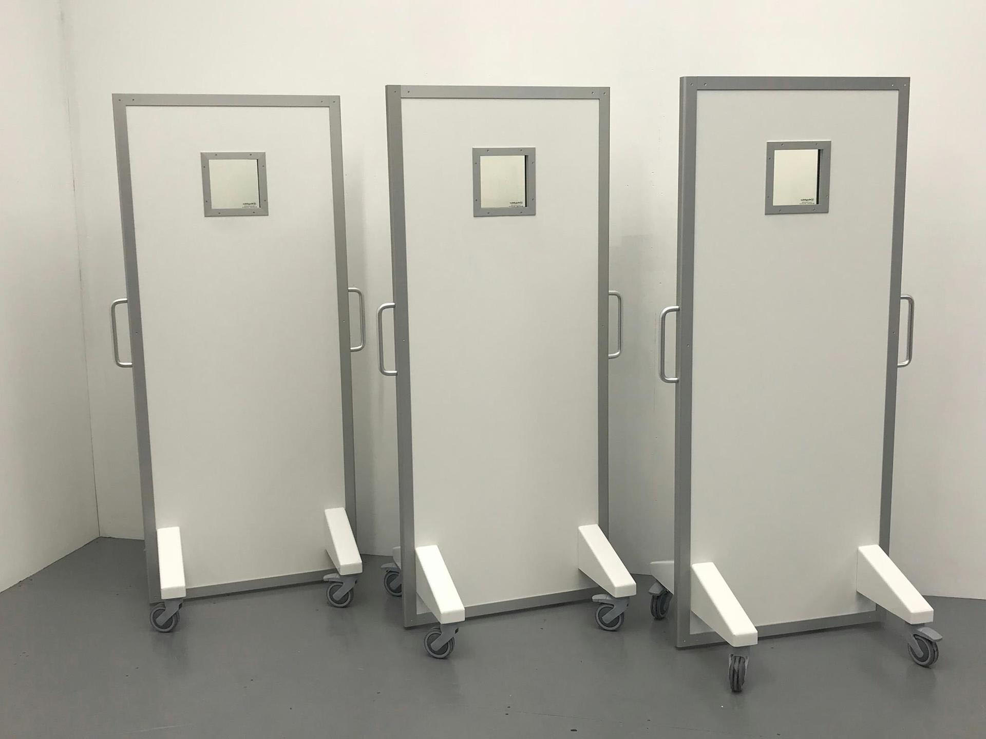 铅屏风由屏风主体、铅玻璃观察窗、移动脚轮、推拉把手组成。